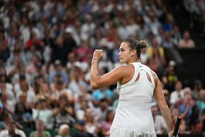 (250705) -- LONDRES, 5 julio, 2025 (Xinhua) -- Imagen del 4 de julio de 2025 de Aryna Sabalenka reaccionando durante...