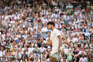 (250705) -- LONDRES, 5 julio, 2025 (Xinhua) -- Imagen del 4 de julio de 2025 de Carlos Alcaraz reaccionando durante...