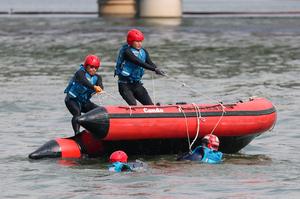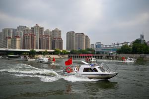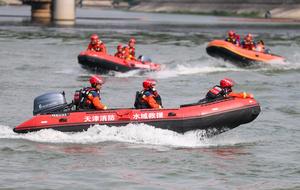(250705) -- TIANJIN, 5 julio, 2025 (Xinhua) -- Rescatistas participan en un simulacro de rescate por inundación en el río...