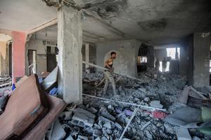 (250705) -- GAZA, 5 julio, 2025 (Xinhua) -- Imagen del 4 de julio de 2025 de un palestino inspeccionando una...