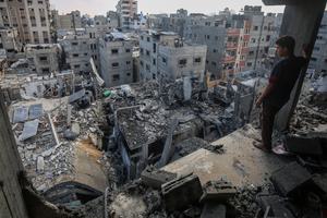 (250705) -- GAZA, 5 julio, 2025 (Xinhua) -- Imagen del 4 de julio de 2025 de un palestino inspeccionando viviendas...