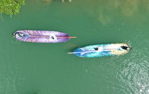 (250704) -- HEFENG, 4 julio, 2025 (Xinhua) -- Imagen del 3 de julio de turistas tomando botes con forma de...