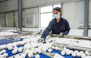 (250704) -- LHASA, 4 julio, 2025 (Xinhua) -- Una trabajadora clasifica huevos en una granja de gallinas ponedoras moderna, en...