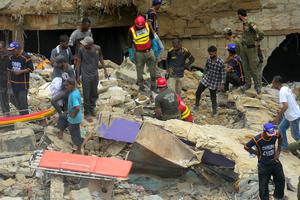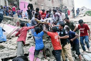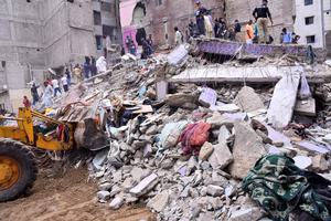 (250704) -- KARACHI , 4 julio, 2025 (Xinhua) -- Rescatistas trabajan en la escena de derrumbe de un edificio residencial,...