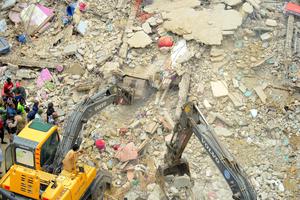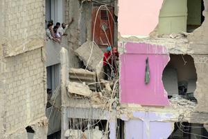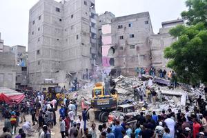 (250704) -- KARACHI , 4 julio, 2025 (Xinhua) -- Rescatistas trabajan en la escena de derrumbe de un edificio residencial,...