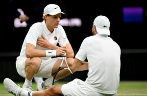 (250708) -- LONDRES, 8 julio, 2025 (Xinhua) -- Imagen del 7 de julio de 2025 de Jannik Sinner (i) revisando...