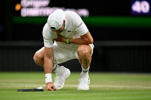 (250708) -- LONDRES, 8 julio, 2025 (Xinhua) -- Imagen del 7 de julio de 2025 de Grigor Dimitrov secándose las...
