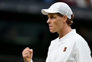 (250708) -- LONDRES, 8 julio, 2025 (Xinhua) -- Imagen del 7 de julio de 2025 de Jannik Sinner festejando un...