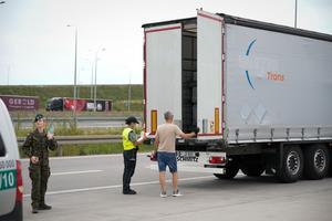 (250707) -- SUWALKI, 7 julio, 2025 (Xinhua) -- Agentes del orden inspeccionan los vehículos que entran en Polonia desde Lituania...