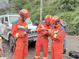(250708) -- XIGAZE, 8 julio, 2025 (Xinhua) -- Rescatistas instalan un sistema de telecomunicaciones móviles de emergencia en el sitio...