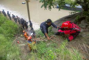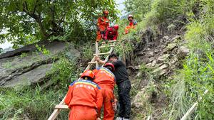(250708) -- XIGAZE, 8 julio, 2025 (Xinhua) -- Rescatistas construyen un camino para la evacuación en el sitio de un...