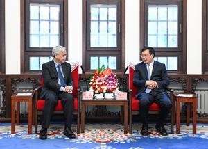 (250708) -- BEIJING, 8 julio, 2025 (Xinhua) -- El presidente de la Agencia de Noticias Xinhua, Fu Hua, se reúne...
