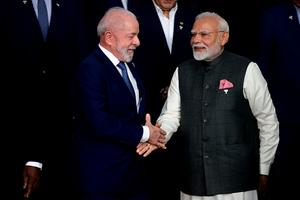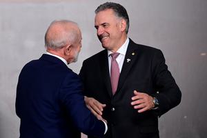 (250707) -- RIO DE JANEIRO, 7 julio, 2025 (Xinhua) -- El presidente brasileño, Luiz Inácio Lula da Silva (c), estrecha...