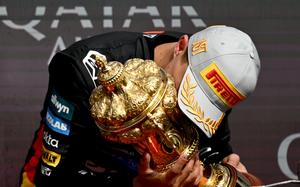 (250707) -- LONDRES, 7 julio, 2025 (Xinhua) -- Imagen del 6 de julio de 2025 del piloto británico de la escudería McLaren, Lando Norris, besando su trofeo durante la ceremonia de premiación del Gran Premio de Reino Unido de Fórmula Uno 2025, en el Circuito de Silverstone, en Londres, Reino Unido. (Xinhua/Li Ying) (rtg) (ah) (vf)