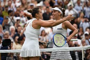 (250707) -- LONDRES, 7 julio, 2025 (Xinhua) -- Imagen del 6 de julio de 2025 de Aryna Sabalenka (i) saludando a Elise Mertens al termino del partido de cuarta ronda de individuales femeninos entre Aryna Sabalenka de Bielorrusia y Elise Mertens de Bélgica en el Campeonato de Tenis de Wimbledon, en Londres, Reino Unido. (Xinhua/Zhao Dingzhe) (oa) (ah) (vf)