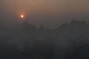 (250708) -- MONTEVIDEO, 8 julio, 2025 (Xinhua) -- Imagen tomada con un dron el 8 de julio de 2025 de edificios vistos en medio de la niebla, en Montevideo, capital de Uruguay. (Xinhua/Nicolás Celaya) (nc) (oa) (ah) (ce)