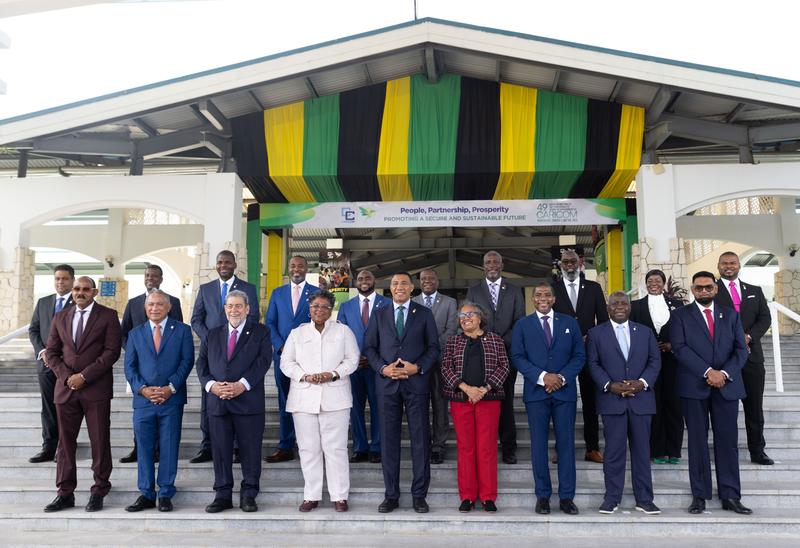 (250709) -- MONTEGO BAY, 9 julio, 2025 (Xinhua) -- Imagen del 7 de julio de 2025 de representantes posando para una fotografía grupal durante la 49ª Reunión Ordinaria de la Conferencia de Jefes de Gobierno de la Comunidad del Caribe (CARICOM), en Montego Bay, Jamaica. La reunión de tres días concluyó el 8 de julio en Montego Bay, ciudad portuaria en el norte de Jamaica. (Xinhua/Li Mengxin) (jg) (da) (vf)