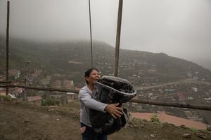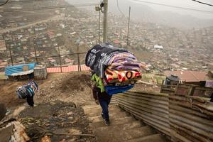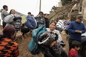 (250709) -- LIMA, 9 julio, 2025 (Xinhua) -- Personas trasladan cobijas donadas por voluntarios durante la época de bajas temperaturas...