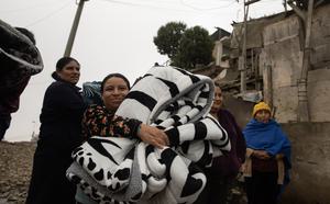 (250709) -- LIMA, 9 julio, 2025 (Xinhua) -- Una mujer es vista con una cobija donada por voluntarios durante la...
