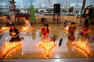 (250709) -- YANGON, 9 julio, 2025 (Xinhua) -- Personas encienden velas durante las celebraciones del día de luna llena de...