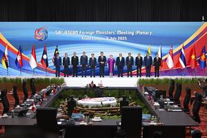 (250709) -- KUALA LUMPUR, 9 julio, 2025 (Xinhua) -- Asistentes posan para una fotografía grupal en la 58 Reunión de...