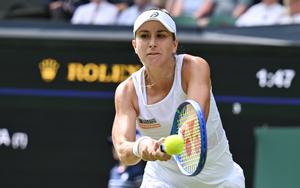 (250709) -- LONDRES, 9 julio, 2025 (Xinhua) -- Belinda Bencic devuelve la pelota durante el partido de cuartos de final...
