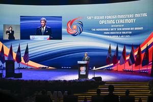 (250709) -- KUALA LUMPUR, 9 julio, 2025 (Xinhua) -- El primer ministro malasio, Anwar Ibrahim, habla en la 58 Reunión...