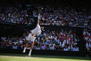 (250710) -- LONDRES, 10 julio, 2025 (Xinhua) -- Imagen del 9 de julio de 2025 de Novak Djokovic sirviendo la...