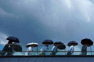 (250710) -- OSAKA, 10 julio, 2025 (Xinhua) -- Una mujer camina en la calle con una sombrilla, en Osaka, Japón,...