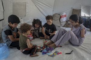 (250710) -- GAZA, 10 julio, 2025 (Xinhua) -- Imagen del 29 de junio de 2025 de Sara al-Borsh jugando con...