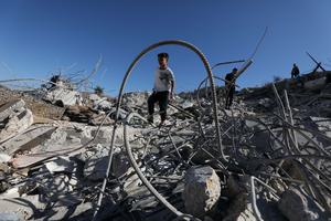 (250710) -- NAPLUSA, 10 julio, 2025 (Xinhua) -- Imagen del 9 de julio de 2025 de palestinos inspeccionando los escombros...