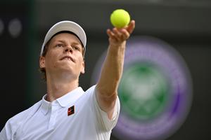 (250710) -- LONDRES, 10 julio, 2025 (Xinhua) -- Imagen del 9 de julio de 2025 de Jannik Sinner sirviendo la...