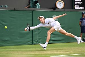(250710) -- LONDRES, 10 julio, 2025 (Xinhua) -- Imagen del 9 de julio de 2025 de Jannik Sinner devolviendo la...
