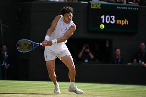 (250710) -- LONDRES, 10 julio, 2025 (Xinhua) -- Imagen del 9 de julio de 2025 de Ben Shelton devolviendo la...