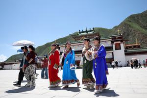 (250711) -- XIAHE, 11 julio, 2025 (Xinhua) -- Imagen del 10 de julio de 2025 de turistas visitando el Monasterio...