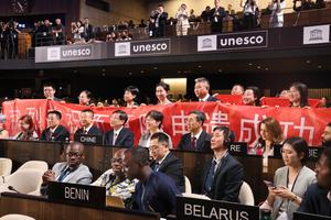 (250711) -- PARIS, 11 julio, 2025 (Xinhua) -- Delegados chinos festejan la inscripción de las Tumbas Imperiales de Xixia de...