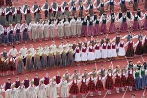 (250711) -- RIGA, 11 julio, 2025 (Xinhua) -- Participantes realizan una presentación durante un gran espectáculo de danza folclórica durante...
