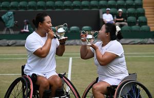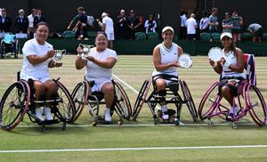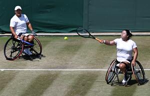 (250713) -- LONDRES, 13 julio, 2025 (Xinhua) -- Li Xiaohui/Wang Ziying (d) compiten durante la final de dobles femeninos en...