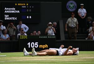 (250713) -- LONDRES, 13 julio, 2025 (Xinhua) -- Imagen del 12 de julio de 2025 de Iga Swiatek festejando su...
