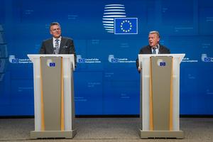 BELGICA-BRUSELAS-JEFE DE COMERCIO DE LA UE-MINISTRO DE RELACIONES EXTERIORES DANES-EEUU-ARANCELES-CONFERENCIA DE PRENSA