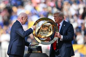 (250714) -- NUEVA JERSEY, 14 julio, 2025 (Xinhua) -- Imagen del 13 de julio de 2025 del presidente estadounidense, Donald Trump (d), y el presidente de la FIFA, Gianni Infantino, sosteniendo el trofeo durante la ceremonia de premiación del partido final entre Chelsea FC, de Inglaterra, y Paris Saint-Germain, de Francia, en la Copa Mundial de Clubes de la FIFA 2025, en el MetLife Stadium, en Nueva Jersey, Estados Unidos. (Xinhua/Wu Xiaoling) (rtg) (ah)