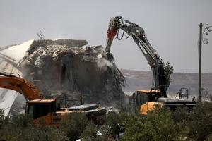 (250714) -- BELEN, 14 julio, 2025 (Xinhua) -- Excavadoras israelíes demuelen una casa palestina, en Belén, en el sur de Cisjordania, el 14 de julio de 2025. (Xinhua/Mamoun Wazwaz) (rtg) (ah) (vf)