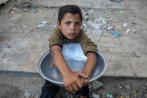 (250715) -- GAZA, 15 julio, 2025 (Xinhua) -- Imagen del 14 de julio de 2025 de un niño palestino desplazado esperando recibir alimentos gratuitos de un centro de distribución de alimentos, en la Ciudad de Gaza. (Xinhua/Rizek Abdeljawad) (oa) (ah) (vf)