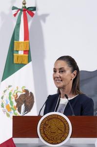 (250714) -- CIUDAD DE MEXICO, 14 julio, 2025 (Xinhua) -- Imagen proveída por la Presidencia de México de la presidenta mexicana, Claudia Sheinbaum, sonriendo durante su conferencia de prensa matutina en Palacio Nacional, en la Ciudad de México, capital de México, el 14 de julio de 2025. Sheinbaum aseguró el lunes que antes de tomar medidas para hacer frente a un nuevo arancel de 30 por ciento a productos de origen mexicano anunciado por Estados Unidos, espera alcanzar un acuerdo, que además garantice "la soberanía como un principio innegociable". (Xinhua/Presidencia de México) (rtg) (ah) (vf)