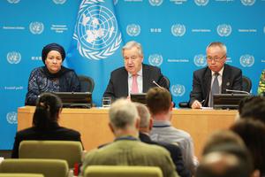 (250714) -- NACIONES UNIDAS, 14 julio, 2025 (Xinhua) -- El secretario general de la ONU, Antonio Guterres (c), habla en el lanzamiento del Informe sobre los Objetivos de Desarrollo Sostenible 2025, en la sede de la ONU, en Nueva York, el 14 de julio de 2025. A solo cinco años de su cumplimiento, solo el 35 por ciento de las metas de los Objetivos de Desarrollo Sostenible están bien encaminadas, mientras que casi la mitad están estancadas y el 18 por ciento han retrocedido, según un informe de la ONU publicado el lunes. (Xinhua/Xie E) (oa) (ah) (ce)