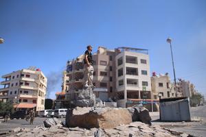 (250715) -- DAMASCO, 15 julio, 2025 (Xinhua) -- Fuerzas de seguridad sirias son vistas al entrar en la ciudad de...