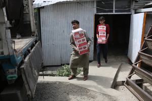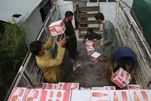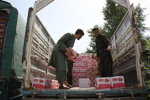 (250715) -- KABUL, 15 julio, 2025 (Xinhua) -- Trabajadores cargan productos alimenticios caducados y de baja calidad, en Kabul, capital...