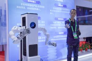 (250716) -- BEIJING, 16 julio, 2025 (Xinhua) -- Un trabajador opera un robot a través de dispositivos portátiles durante la...