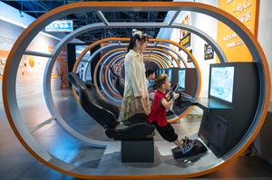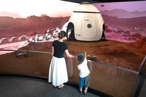 (250718) -- WUHAN, 18 julio, 2025 (Xinhua) -- Un niño conduce un vehículo de ingeniería simulado de Marte en una...