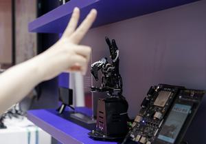 (250717) -- BEIJING, 17 julio, 2025 (Xinhua) -- Un visitante interactúa con una mano biónica inteligente en el estand de...